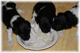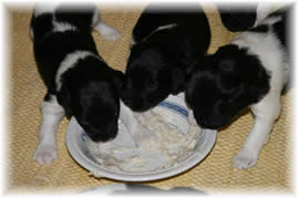8/4-07 3 uker siden valpene ble født i går, og utviklingen har vært enorm den siste uken. Nå har de begynt å få tenner, og det er ikke noe Alfi gleder seg over. Ser at hun ikke har såå lyst til å gi dem mat lenger. Men, må man, så må man. Valpene er fortsatt litt løse i magen, selv om Alfi har blitt bra. De fikk grøt for første gang i går, noe de syntes var godt. Fortsetter de med å være løse i magen om en ukes tid, blir vi nok nødt til å kontakte veterinær, men håper vi slipper det. Heldigvis legger de på seg til tross for de problemene. Aktivitetsnivået er meget stigende, valpene har tatt sine første skritt utenfor valpekassa etter at vi flyttet dem opp i stua og valpegården, og det virket ikke som det var spesielt skummelt. Lydnivået er også oppadgående. Nå skal tilleggsfòringen øke gradvis dag for dag, og regner med at vekten følger økningen. 3 weeks since the puppies birth yesterday, and they have developed very much this last week. Now their teeth are coming, and Alfi is not very found of that. Can see that she is not so pleased to feed them anymore. But, that is something she has to live with some weeks. The puppies are still a little bit loose in their stomachs, even though Alfi has been well. Yesterday they got porridge for the first time, and that tasted very good. If they continue with these problems after a week with another food, we have to contact the vet, but we hope that we don't have to do that. In spite of these problems the puppies increase their weight. The activity of the puppies are going up, they have taken their first steps outside their "safe" room after we moved them up in the living room, and it didn't look like that was very scary. The loud is much higher. This week we will feed them a little bit more day by day, and we count that the weight will follow. |