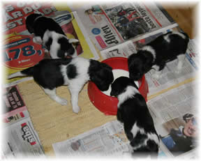 13/4-07 4 uker i morgen, og halvveis allerede. Dette er bilder tatt siste uken, og som dere ser er det mange matbilder. Så er det også første uken valpene har fått annen mat enn morsmelk. Magene deres har blitt bra, og det er vi veldig glade for. Denne uken har de fått kjøttdeig i grøten og det har vært veldig populært. I går fikk de også smake brødbiter med leverpostei, og litt uttynnet, lunken Cultura. Tirsdag leverte jeg forhåndsregistreringen av kullet til NKK, og da er det bare å vente på at de får tildelt registreringsnummer. De vil være forsikret i Agria fra de er 5 uker og frem til levering. I går fikk de sin første ormekur, og av det jeg har sett av avføring, har ikke jeg sett at det har kommet noen døde ormer ut enda ihvertfall. Foreløpig synes jeg det er en fredelig gjeng vi har med å gjøre, men de virker friske, så da regner jeg med at de er fornøyde og mette. I dag kjøpte jeg noen stoffleker og knuter til dem, og det var populært. Dvs at stofflekene var mest populære. Kua med knuter var ganske populær den også. 4 weeks tomorrow, and half time is gone already. This is pictures taken the last week, and as you can see it is many foodpictures. It is the first week the puppies have got another food than the milk from Alfi. Their stomachs have been well, and we are happy for that. This week they have got meat mixed into the porridge and that has been very popular. Yesterday they tasted some bread with liver paste, and a bit Cultura milk that was lukewarm and thinned out a bit. Tuesday I delivered the registration of the litter to the Norwegian Kennel Club, and it's only to wait for the registrationnumbers. They will be insured in Agria from they are 5 weeks and until delivery. Yesterday they got their first worm treatment, and what I have seen, there have been no dead worms. For the being I think it is a peaceful gang we have to deal with, but they seems healthy, so I count that they are satisfied. Today I bought some textiletoys and knots for them, and that was popular, specially the textiltoys. The cow with knots was popular as well. |