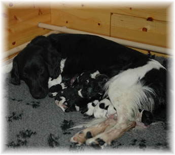 8/3-09 Alle valpene er solgt og levert. Tispa er solgt til Sverige, en av hannene til Danmark, og resten rundt omkring i Norge. Da valpene var seks uker ble det oppdaget at tre av hannene var trefarget. Vi visste den fargen lå på Bailos linjer, nå vet vi også hvor på Bebes linjer den ligger. All the puppies are sold and delivered. The female is sold to Sweden, one of the males to Denmark, and the rest to different places in Norway. When the puppies were six weeks old it was discovered that three of the males were tricolour. We knew that this colour was at Bailos lines, now we know where in Bebes lines it is. |