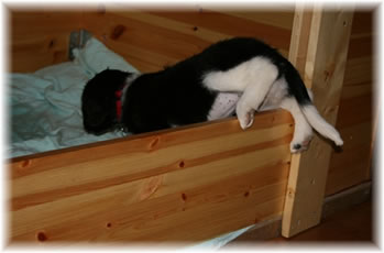 20/9-07 Stine har sendt meg noen flere bilder fra i sommer, det ene er fra utstillingen i Lofoten der de sitter med rosetter og premier. De andre bildene viser at Buffi er veldig glad i å bite på labben sin, også har hun som stabijer flest noen merksnodige liggestillinger. Stine has send me some more pictures from this summer, one of them is from the dog show in Lofoten where they sit together with rosettes and prizes. The other pictures show that Buffi is very fond of biting at her foot, and like other stabijs she has a lot of strange ways to lie. |