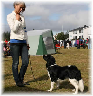 NKKs internasjonale utstilling i Hålogalandshallen, Harstad, 20.4.08 Dommer: Leni Finne, Finland Juniorklasse/Junior class Antall påmeldte/number of registrated: 2 Korrekte proporsjoner, tilrekkelig benstamme, velformet hode, trivelig uttrykk, korrekte øyne og ører. Platt forbryst, tilrekkelige vinkler. Korrekt brystkasse, noe for oppdragen buklinje. Antydning høy i hasen, velvinklet bak. Korrekt steglengde, noe ustadige haser. Velvist. 1 JK, 1 JKK, HP (1. prize, no. 1 in junior class, Prize of Honour)