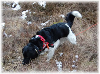 I forrige uke fikk Amigo prøve seg på et ordentlig ettersøk han også (Shila har også gjort det). Sonny sporet opp dyret først, og etterpå fikk Amigo lov. Det var visst noe helt annet enn å finne en klov i sporslutt, halen hadde logret som bare det. |