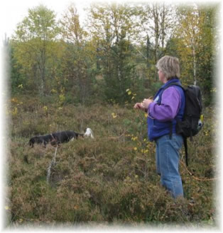 16/10-06 Da ble det blodspor på Ambra denne helgen, hadde blod til bare et spor (og det hadde jeg fått låne av Gry og Kenneth, tusen takk). I og med at jeg er så dårlig på hvor mange meter jeg går i skogen hadde jeg denne gangen fått låne GPSn til Lars, det var effektivt. Sporet ble lagt lørdag kveld ved 18-tiden, det var nøyaktig 600 meter, 10 meter blodopphold rett frem, en vinkel med blod og en uten, fant noe som lignet et naturlig sårleie og dryppet blod oppi der. Gikk sporet kl. 8 søndag morgen, dvs at sporet hadde en liggetid på 14 timer. Det var vindstille da sporet ble lagt, men et lite drag i lufta om morgenen. Pga jakttid var både Ambra og jeg ikledd refleksvester. Hun startet veldig bra med høy motivasjon, men ikke fort, og dro antakeligvis ut på et ferskspor etter en stund (jeg tenkte ikke på å sjekke, men skal huske på det neste gang, Helga-Mari trodde kanskje det kunne være det). Rotet litt i vinkelen med blod, men tok seg inn igjen etterhvert, sårleiet fikk hun ikke med seg da hun gikk på oversiden av sporet akkurat der. Rotet også en del i forbindelse med blodoppholdet rett frem, men hun har såklart lov til å sjekke ut også. Ambra fikk også problemer der sporet gikk gjennom tett gammelt hoggormsgress, men hentet seg etterhvert inn igjen. Vinkelen uten blod tok hun veldig bra etter å ha sjekket litt ut, og resten av sporet gikk omtrent som på skinner, regner med at hun fikk ordentlig lukt i nesa den veien. Fikk testet henne ut litt opp en skråning der jeg syntes det var vanskelig å gå, sluttet med blod i bånn, jeg gikk litt til høyre der det var enklere å gå og la blod rett ovenfor der jeg burde ha gått. Der dro hun rett opp på blodsporet, gøy! Litt senere i sporet dro hun opp en skogsfugl som lå rett under en liten granbusk og da ble det fart i henne. Ambra fikk dra etter så lang lina var og der var det bråstopp. Jeg sto bare helt stille hele tiden, og etter en stund tok hun opp blodsporet igjen. Resten av sporet til slutten var kjempebra, og det var lagt inn en liten vinkel til pga at jeg ikke klarte å ta meg ned en bratt skråning. Sporslutten gikk hun først på oversiden av før hun dro ned igjen, og halen gikk som bare det. I hele sporet var motivasjonen høy, men på denne tiden av året er det også høy fuktighet og vitringen er bra. Synes fortsatt det er litt tidlig med sporprøve, men det nærmer seg at jeg vil gjøre et forsøk. Jeg var også ganske stolt av meg selv denne gangen, for selv om jeg hadde merket sporet, så husket jeg hvor det gikk etter at jeg hadde lagt meg lørdag kveld. Det var en god følelse. Bloodtracktraining for Ambra this weekend, had only blood for one track (I borrowed blood from Gry and Kenneth, thank you). I'm so very bad at metres in the wood and this time I borrowed the GPS from Lars, that was a smart thing to do. I did the track saturday evening about 6 PM, it was exactly 600 metres, 10 metres straight ahead without blood, one angle with blood and one without. Sunday morning at 8 AM Ambra and I did the track, and that means that the track had been lying for 14 hours during the night. It was no wind when I did the track, but a little bit in the morning. Because of the huntingtime both Ambra and I wore reflector vest. She started with high motivation, but not fast, and probably she went out for a fresh track after a while (I didn't think about checking, but will rembember that next time, Helga-Mari thought it could have been that). Ambra missed the angle with blood, but after a while she found back, she did the same thing in connection with the 10 metres without blood, but of course she is allowed to check it out. The angle without blood she did very well, and the rest of the track was almost at rails, I guess she got the smell right into her nose here. I had made a test for her, because it was a place it was difficult for me to go, so I dripped blood there and I went a little bit at the right for the track and started to drip again just above. Ambra did the track and not my footsteps, fun!! A little bit later in the track a bird suddenly flew up just in front of her, and that was of course very interesting. Ambra run after it, but not longer than I held her in the line, I waited a little bit and then she started at the bloodtrack again. The rest of the track was very good. |